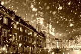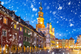 Old town of Poznan on a cold winter night with falling snow, Poland