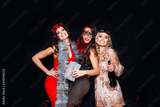 Beautiful Women Celebrating New Year. Portrait Of Happy Smiling Girls In Stylish Glamorous Dresses With Champagne At Birthday Party.