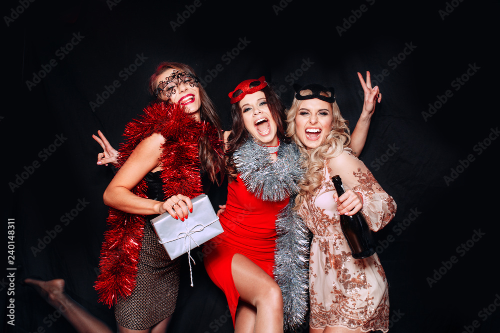 Beautiful Women Celebrating New Year. Portrait Of Happy Smiling Girls In Stylish Glamorous Dresses With Champagne At Birthday Party.
