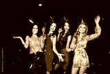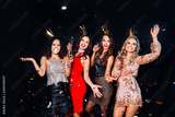 Birthday party, new year carnival. Young smiling women on white background celebrating brightful event, wears elegant fashion dresses and yellow crown. Sparkling confetti, having fun, dancing