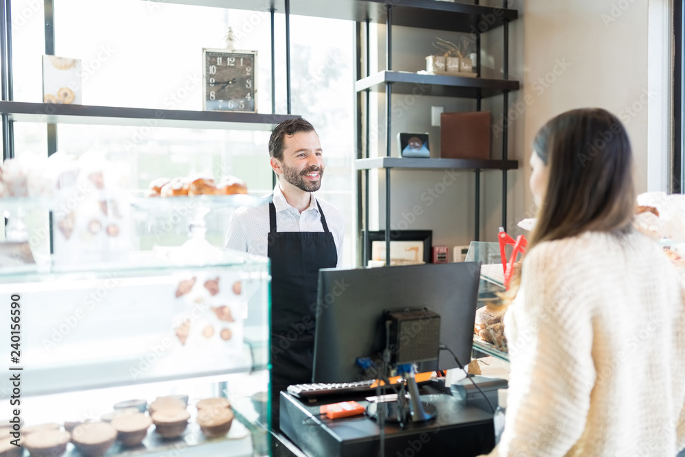 Smiling Baker With Customer In Bakery