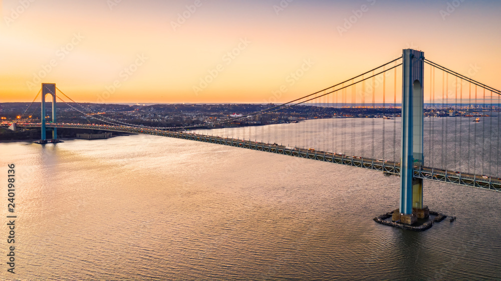 Aerial view of Verrazzano Narrows Bridge at sunset, as viewed from Brooklyn, NY