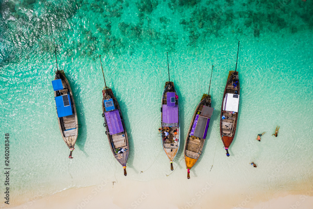 hi season boat and tourists on phiphi island Krabi Thailand aerial view from drone