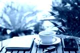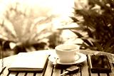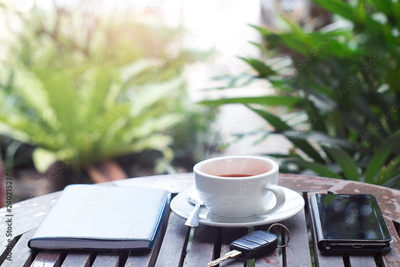 Cup of hot coffee , Key , smartphone and notebook on the wood table.