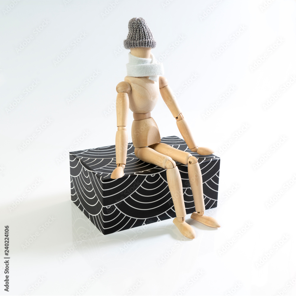 a wooden puppet with scarf and cap sitting on a decorated parallelepiped