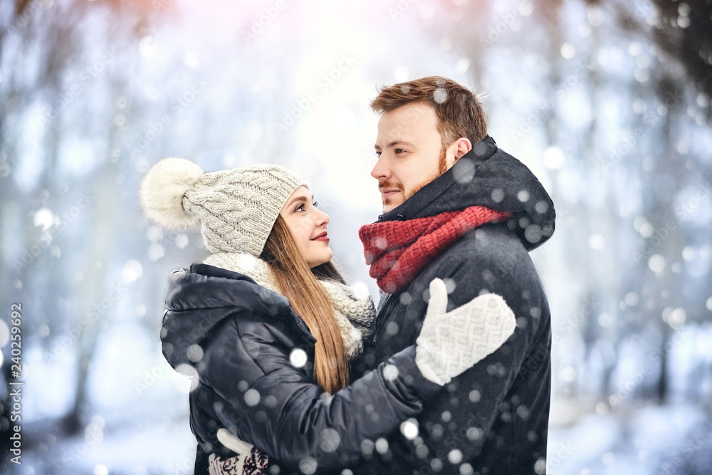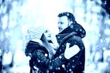 Happy Young Couple in Winter Park laughing and having fun. Family Outdoors.
