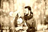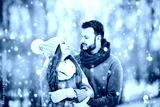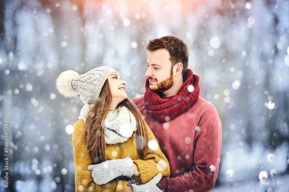 Happy Young Couple in Winter Park laughing and having fun. Family Outdoors.