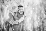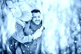 Happy Young Couple in Winter Park laughing and having fun. Family Outdoors.