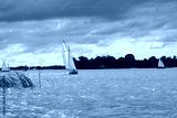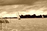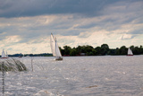 Single sailboat against a cloudy sky on the Loosdrechtse Plassen in Loosdrecht, The Netherlands.