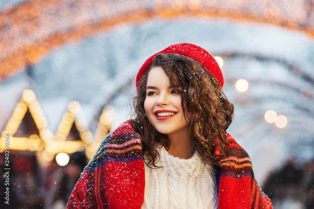 Christmas, New Year, winter holidays concept: close up portrait of young happy smiling girl posing at festive fair in european city. Model wearing red beret, tartan scarf. Copy, empty space for text
