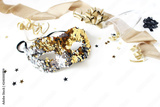 New Year festive still life composition with carnival mask, black and gold confetti stars, ribbons and wine glass. Party decoration, celebration concept. Selective focus.