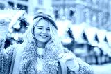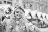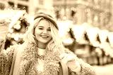 Happy smiling girl holding sparklers, posing at Christmas fair in European city. Copy, empty space for text