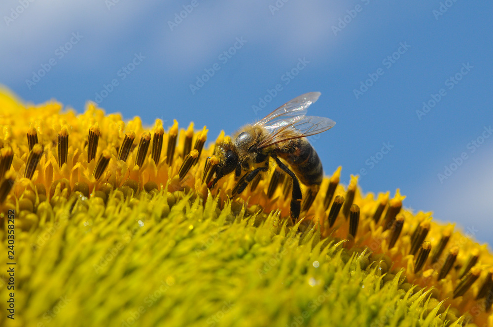 Honey Bee pollinating sunflower. A bee collects nectar from flowers
