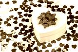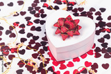 Heart shaped gift box with heart confetti. Passion, love and feelings St Valentine's celebration concept with copy space