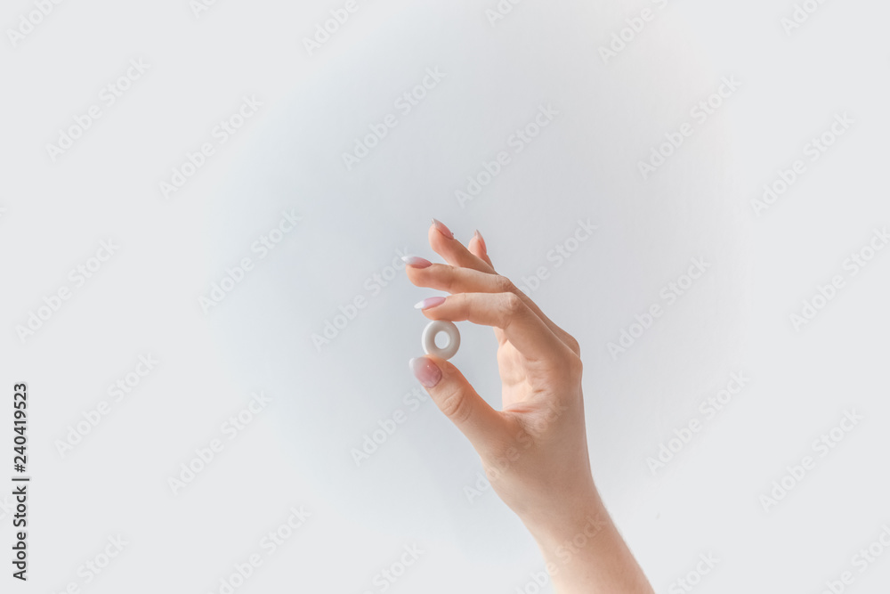 white round pill in hand isolated on white background.