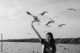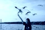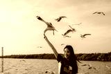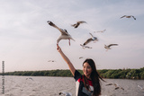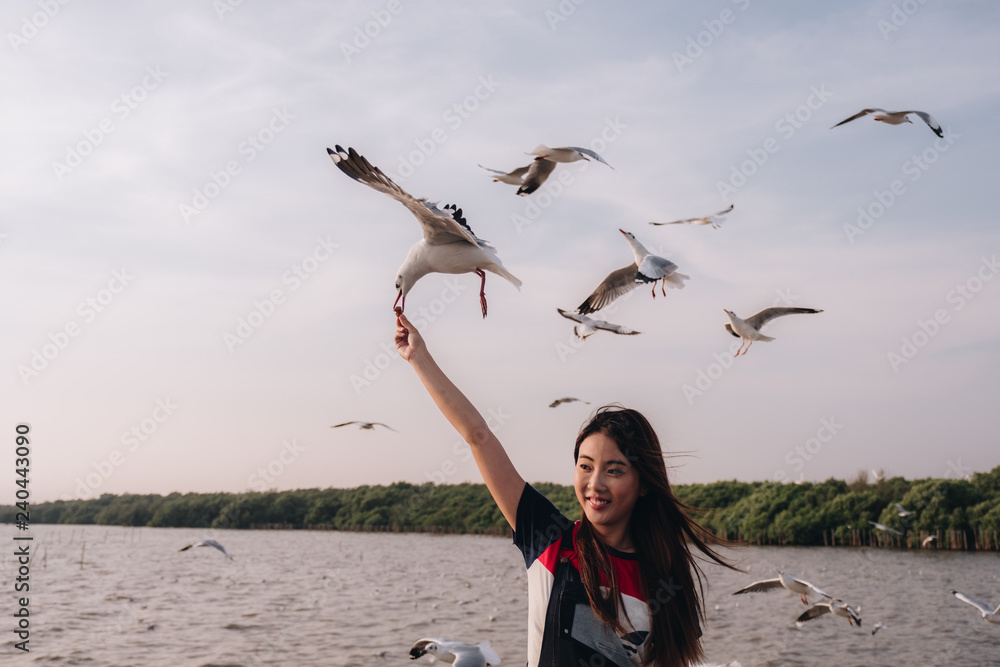 happiness asian woman feeding seagulls, the Bang Poo, Thailand.