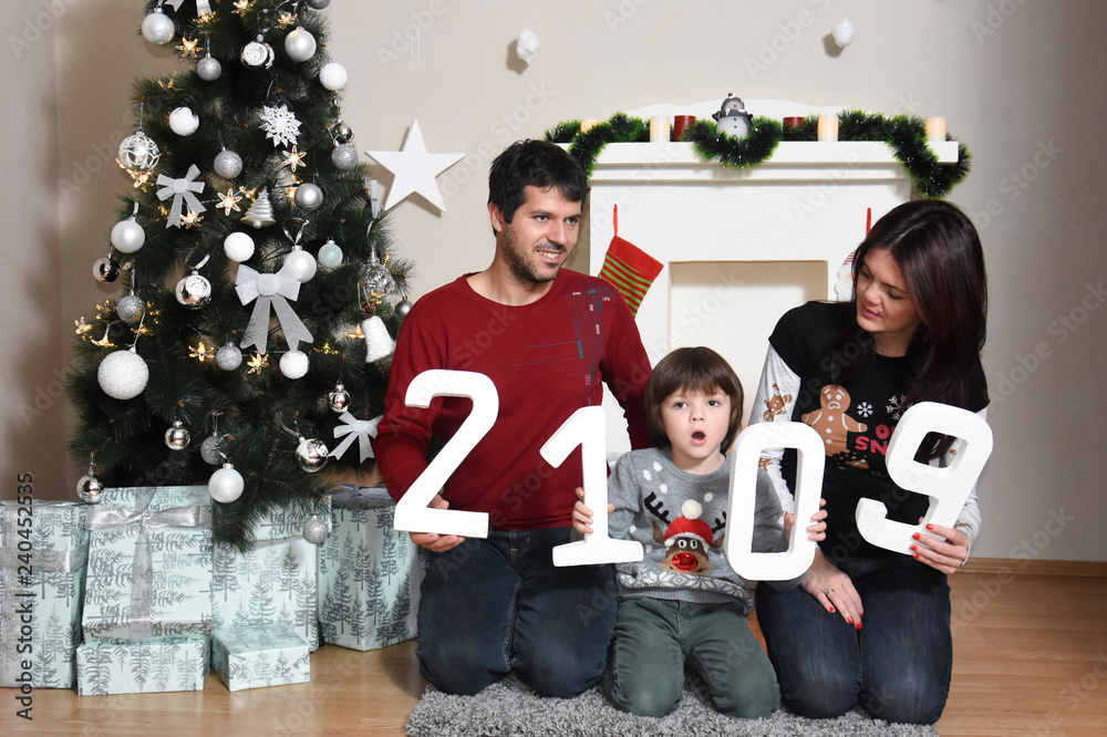 Happy family wait a New Year and play with numbers 2019. Family play and enjoy under Christmas tree