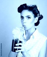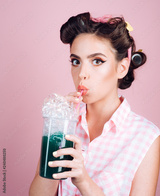 perfect housewife. pinup girl with fashion hair. retro woman drink summer cocktail. pin up woman with trendy makeup. pretty girl in vintage style. suprised girl