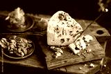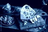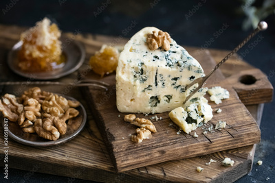 Danish blue cheese on a wooden board with walnut kernels. dark background