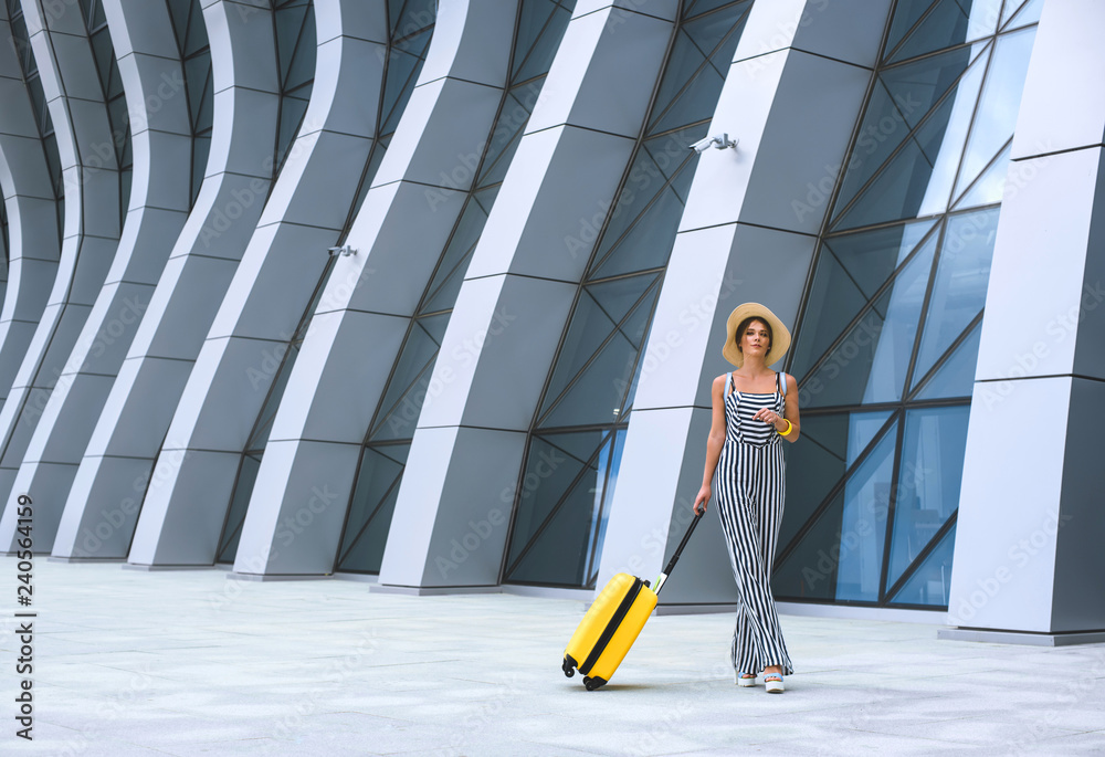 Young stylish Caucasian woman at the airport with a yellow suitcase and a straw hat.