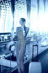 Young stylish Caucasian woman at the airport with a suitcase and a straw hat.