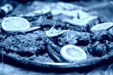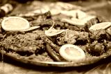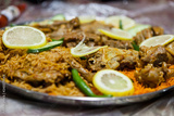 Lamb salona and chicken mandi served on the floor at an Emirati restaurant in Dubai, United Arab Emirates