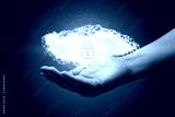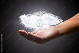 Hand shows a data cloud with a protective shield