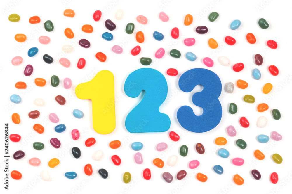 Jelly bean sweets frame and 123 digits. Education and math at school concept with copy space