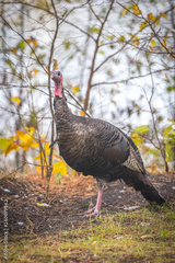 Eastern Wild Turkey (Meleagris gallopavo silvestris) hen in a autumn colored wooded yard pauses momentarily as if to pose for the camera.