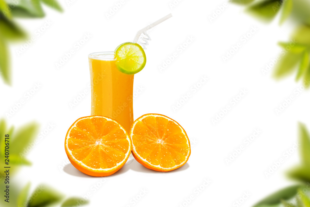 group of orange fruit and oragne juice is on white background design with frame of green leaves