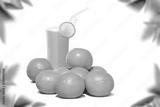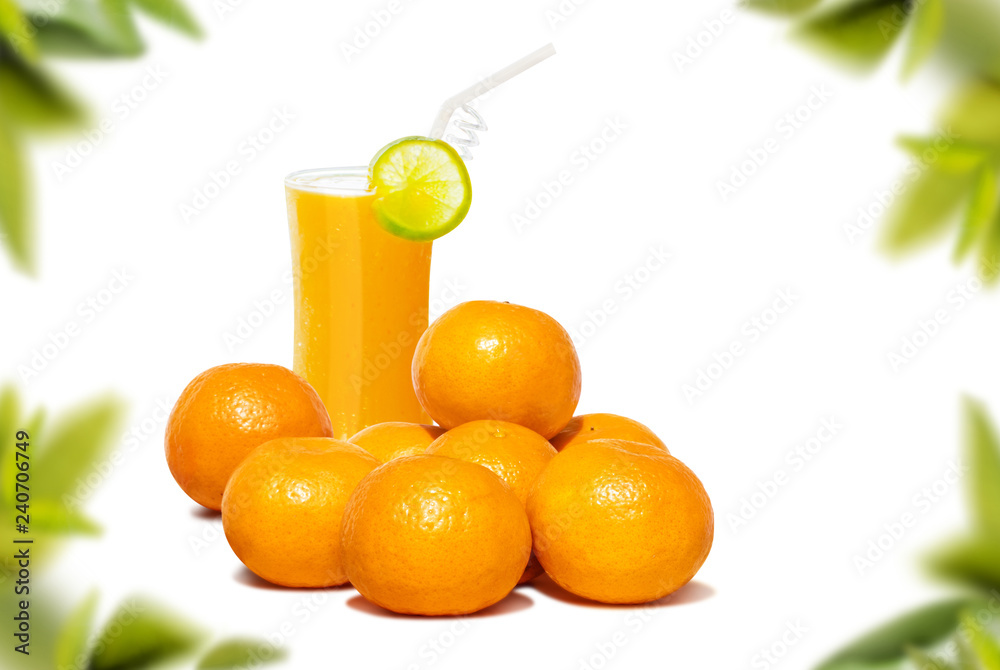 group of orange fruit and oragne juice is on white background design with frame of green leaves