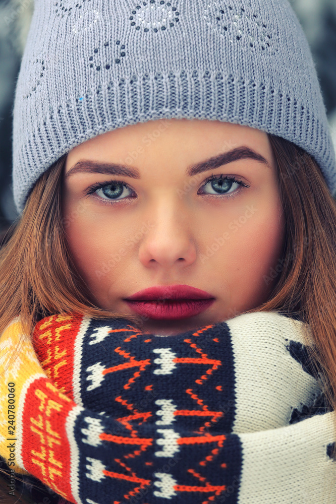 Close up portrait of young woman with blue eyes wearing knitted beanie hat, scarf feeling cold on wintertime. Winter holiday concept. Warm filter