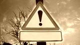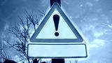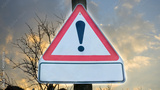 Warning road sign with an exclamation mark icon for high speed alert. Attention or danger sign. Warning symbol in red triangle on sunset sky. Traffic signal to drivers. Safety first driving concept.