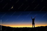 Person with raised arms silhouetted against the sunset and crescent moon.