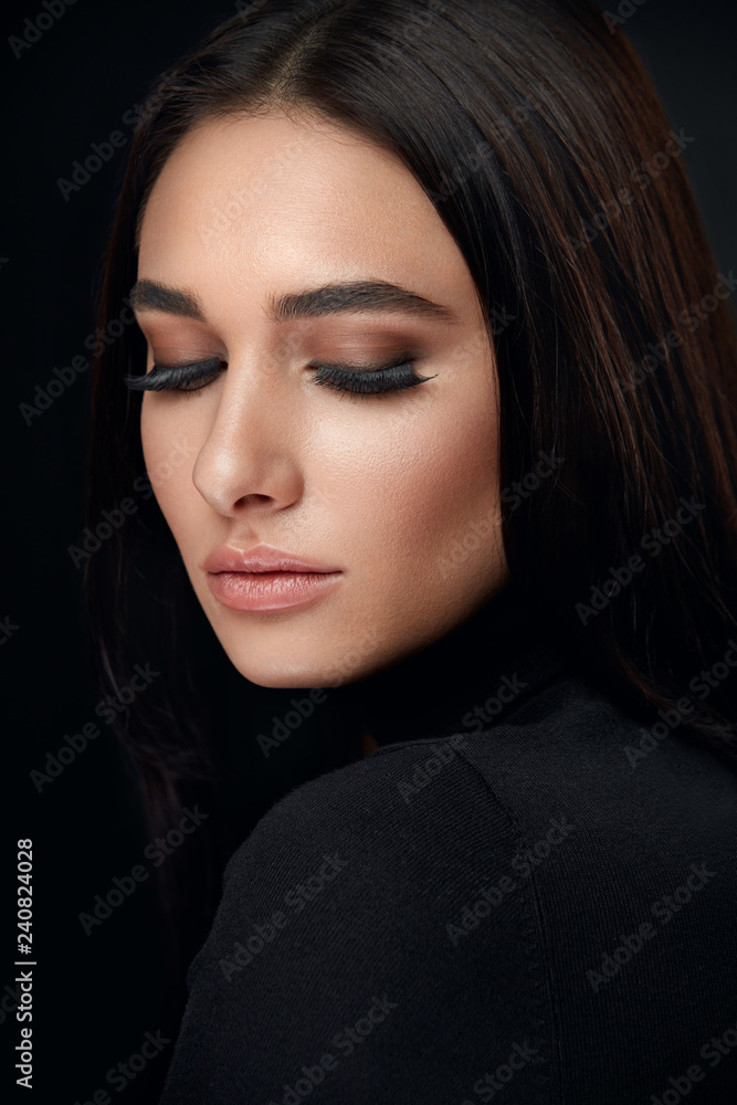 Eyelashes Makeup. Woman Beauty Face With Black Lashes Extensions