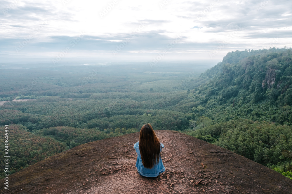 Woman Enjoy the Fresh Air and Embrace the Natureon the three whale rock mountain at Phu Sing , Bueng Kan Province,Thailand