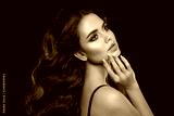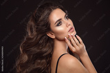 Beautiful woman with long brown curly hair. Closeup portrait with a pretty face of the young girl. Fashion model with manicure nails posing isolated on black background at studio.