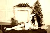Christmas girl holidays. Happy New Year background. Beautiful brunette in woolen sweater and knee high socks lying on fur plaid by white red xmas decoration and christmas tree.
