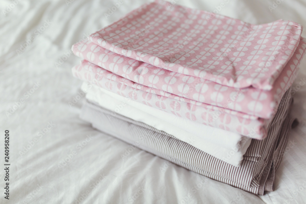 a stack of clean and ironed linen is on the bed