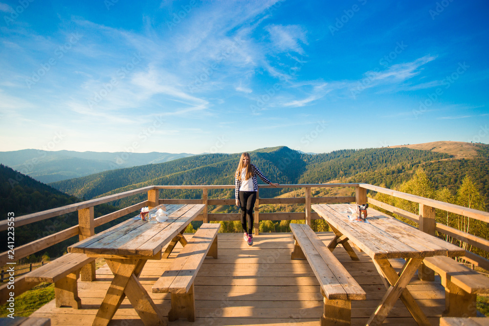 Young woman with long hair have rest in open air cafe on top of mountains and enjoy view