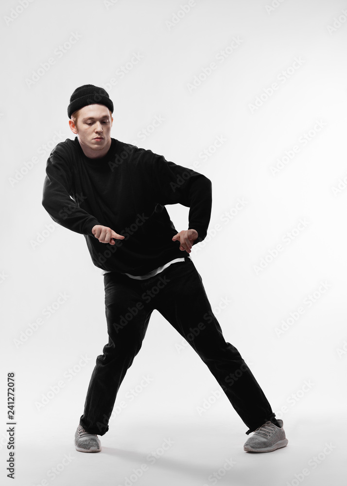 Young dancer dressed in black jeans, sweatshirt, hat and gray sneakers is dancing freestyle in the studio on the white background