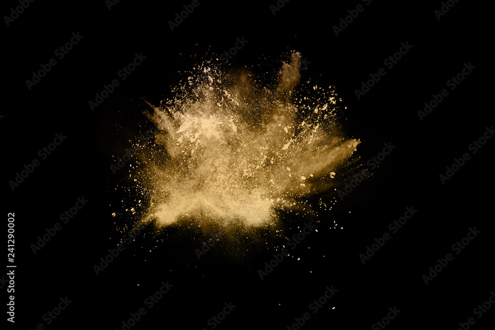 Golden powder explosion on black background. Freeze motion.