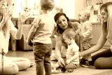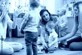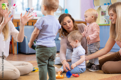 Children with teacher playing educational toys, stacking and arranging colorful pieces. Learning through experience concept, gross and fine motor skills.