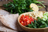 Tabbouleh salad bowl with bulgur, fresh parsley and vegetables served with pita bread