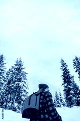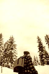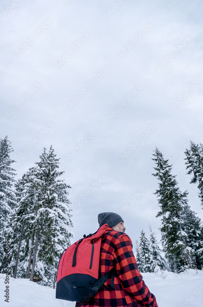 Traveler with a backpack in a warm jacket looks at the winter forest