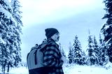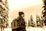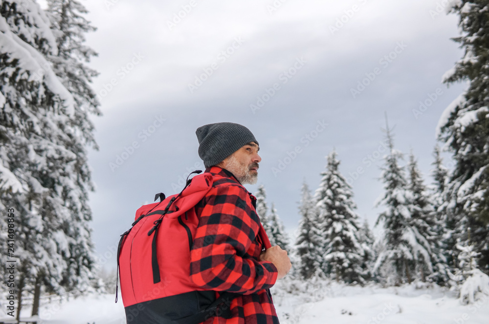 Traveler with a backpack in a warm jacket looks at the winter forest