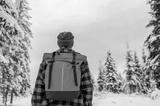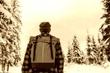Traveler with a backpack in a warm jacket looks at the winter forest