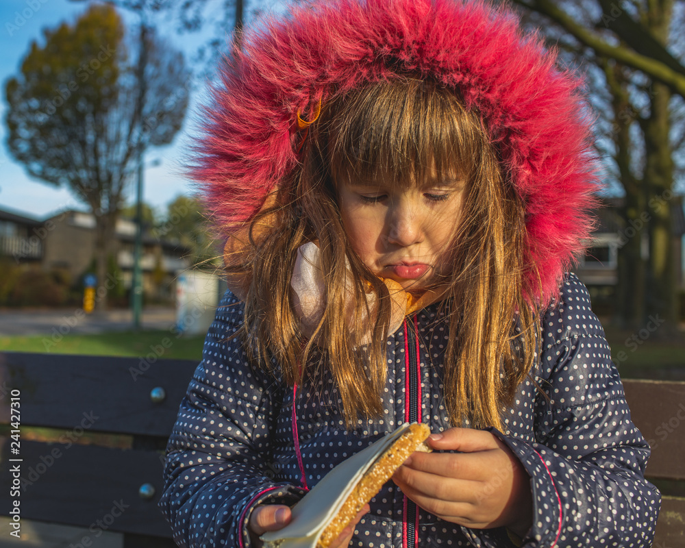Sad little girl with sandwich in her hands, eating problem concept