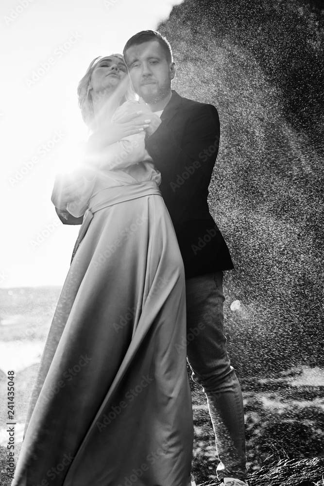 Couple in love stands in the splashes of water against the sunset. A man hugs a woman in a beautiful dress. Love in the eyes
