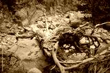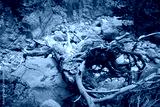 The dead tree lies across the bed of the dried river.